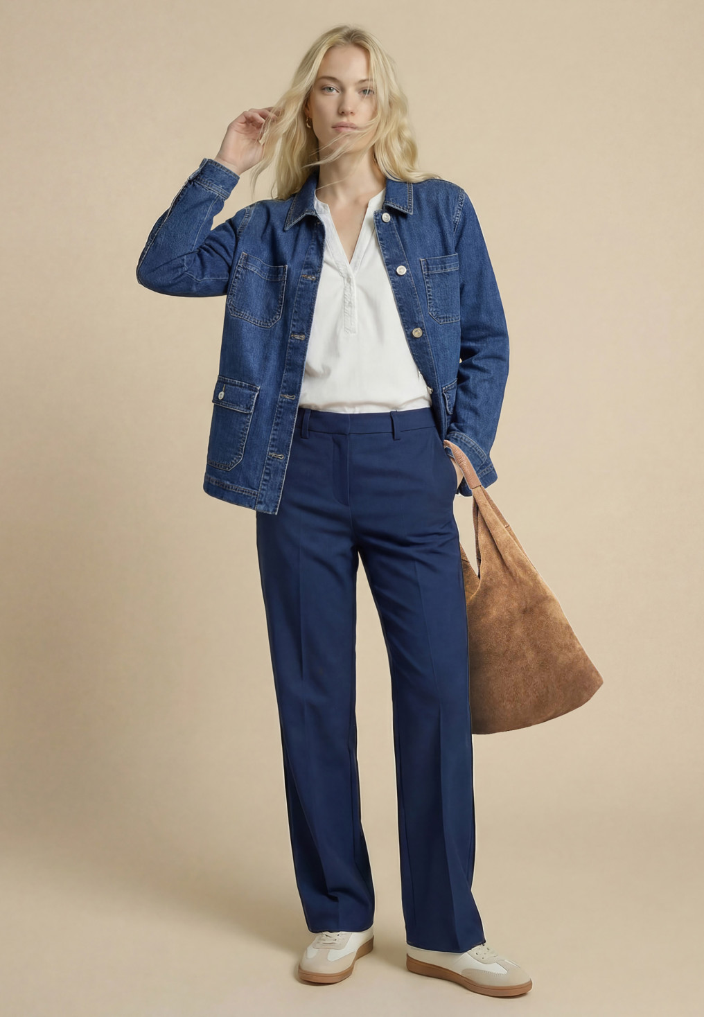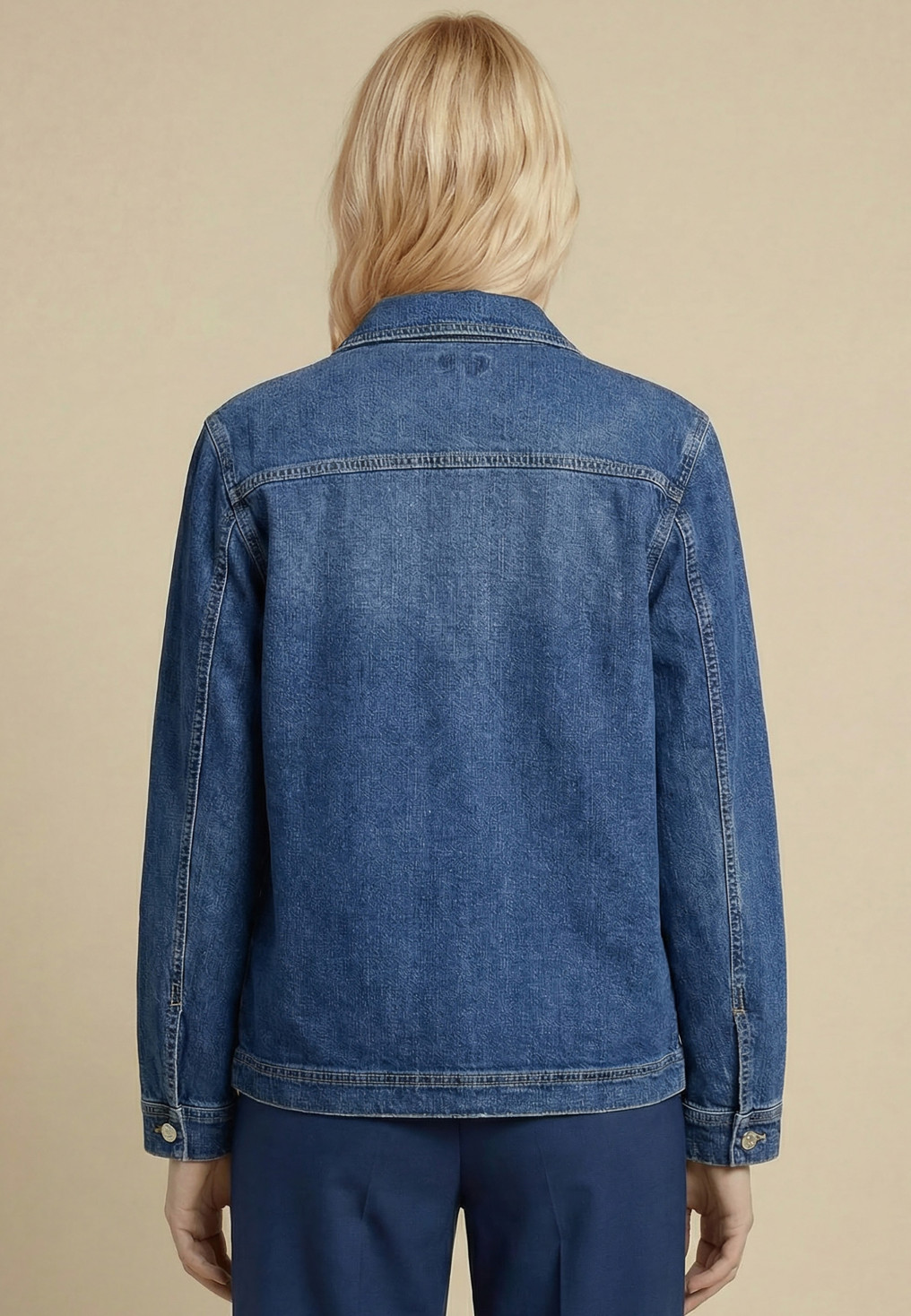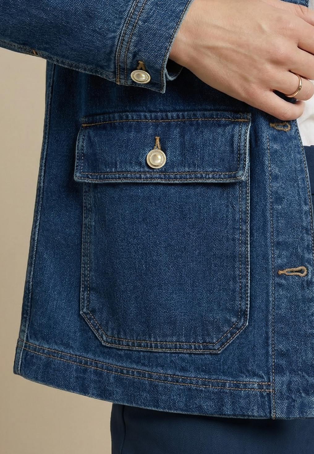 - Coloris bleu denim, surpiqures contrastées