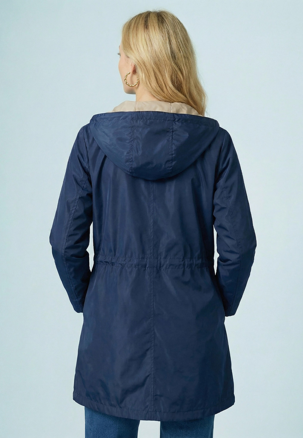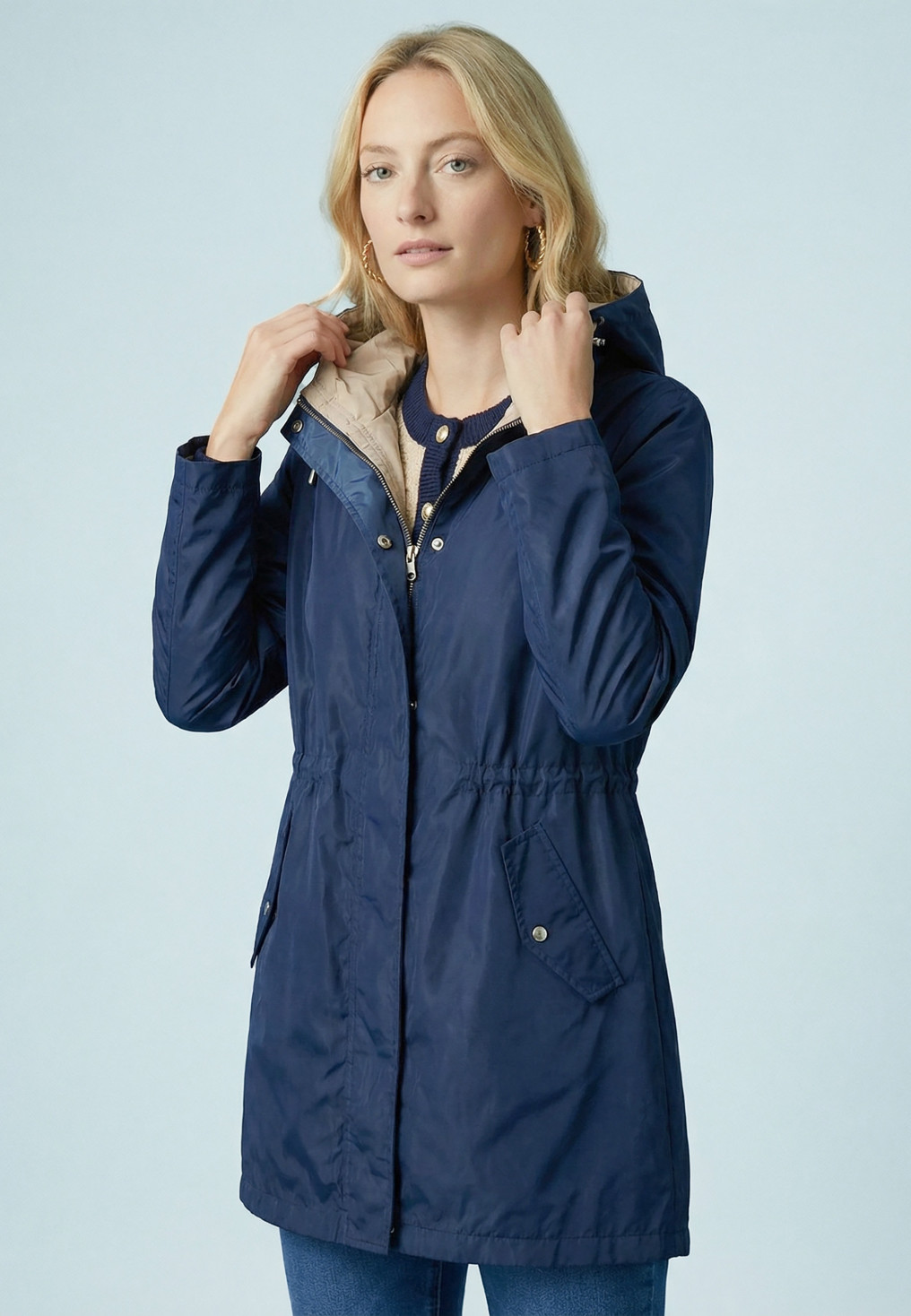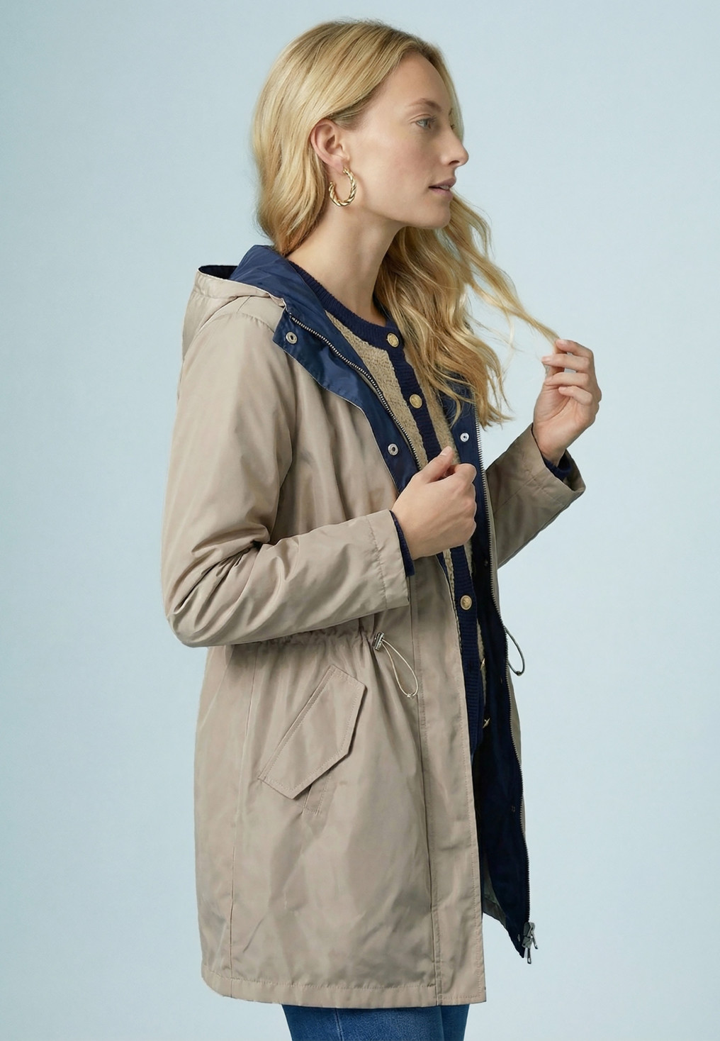 - Col montant, grande capuche avec lien coulissant