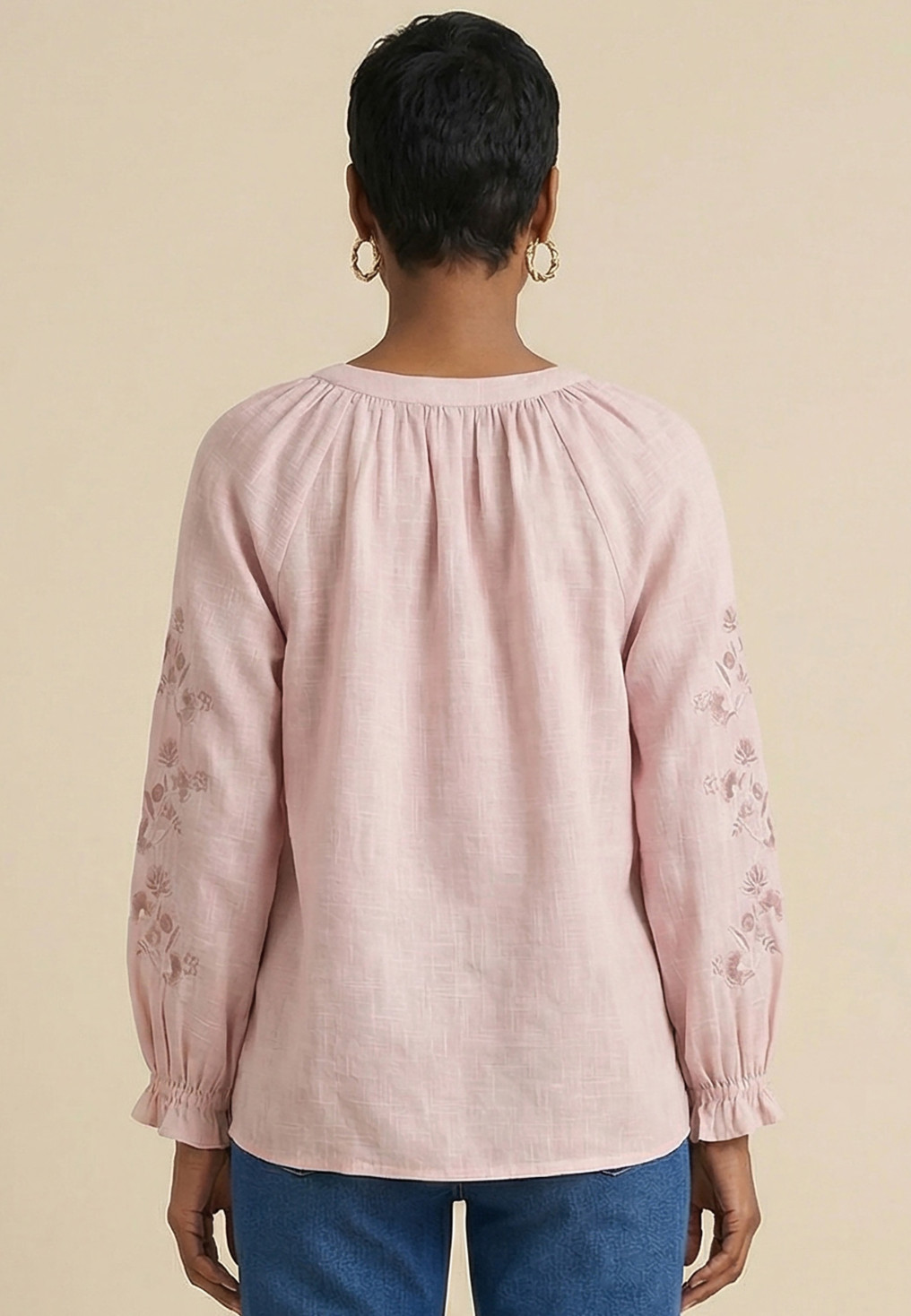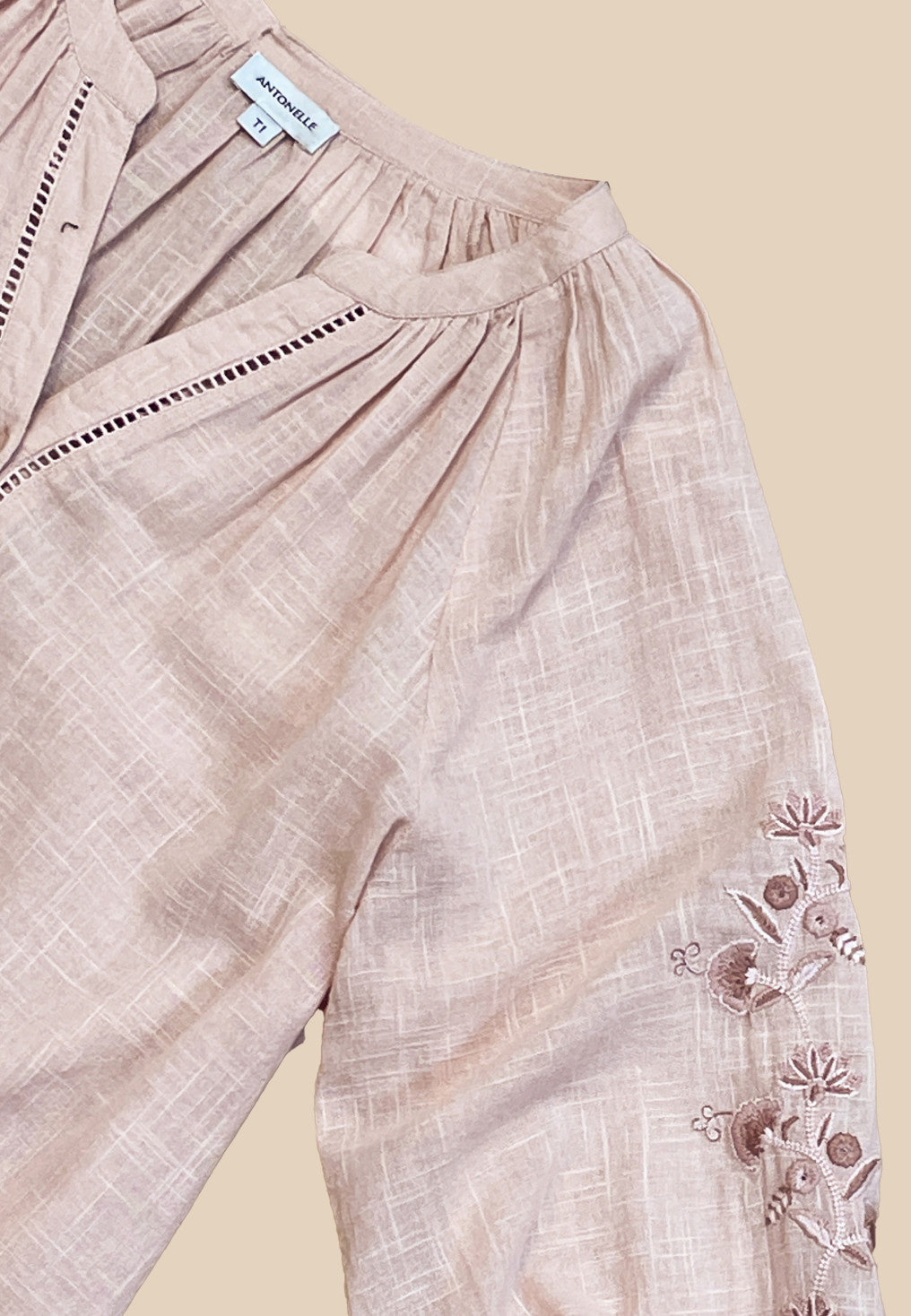 - Détail de la broderie florale ton sur ton sur les manches
