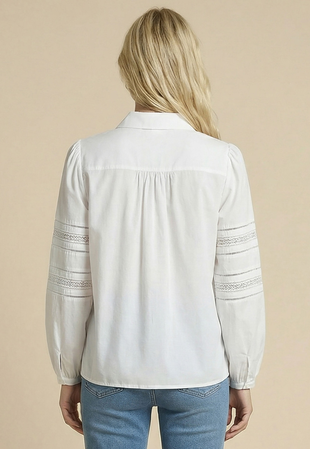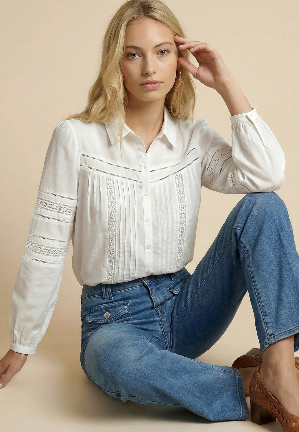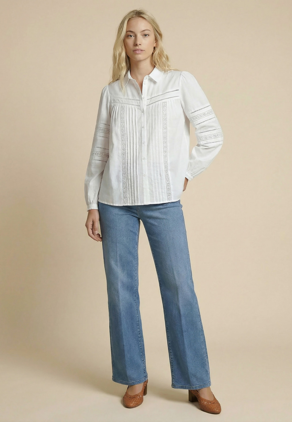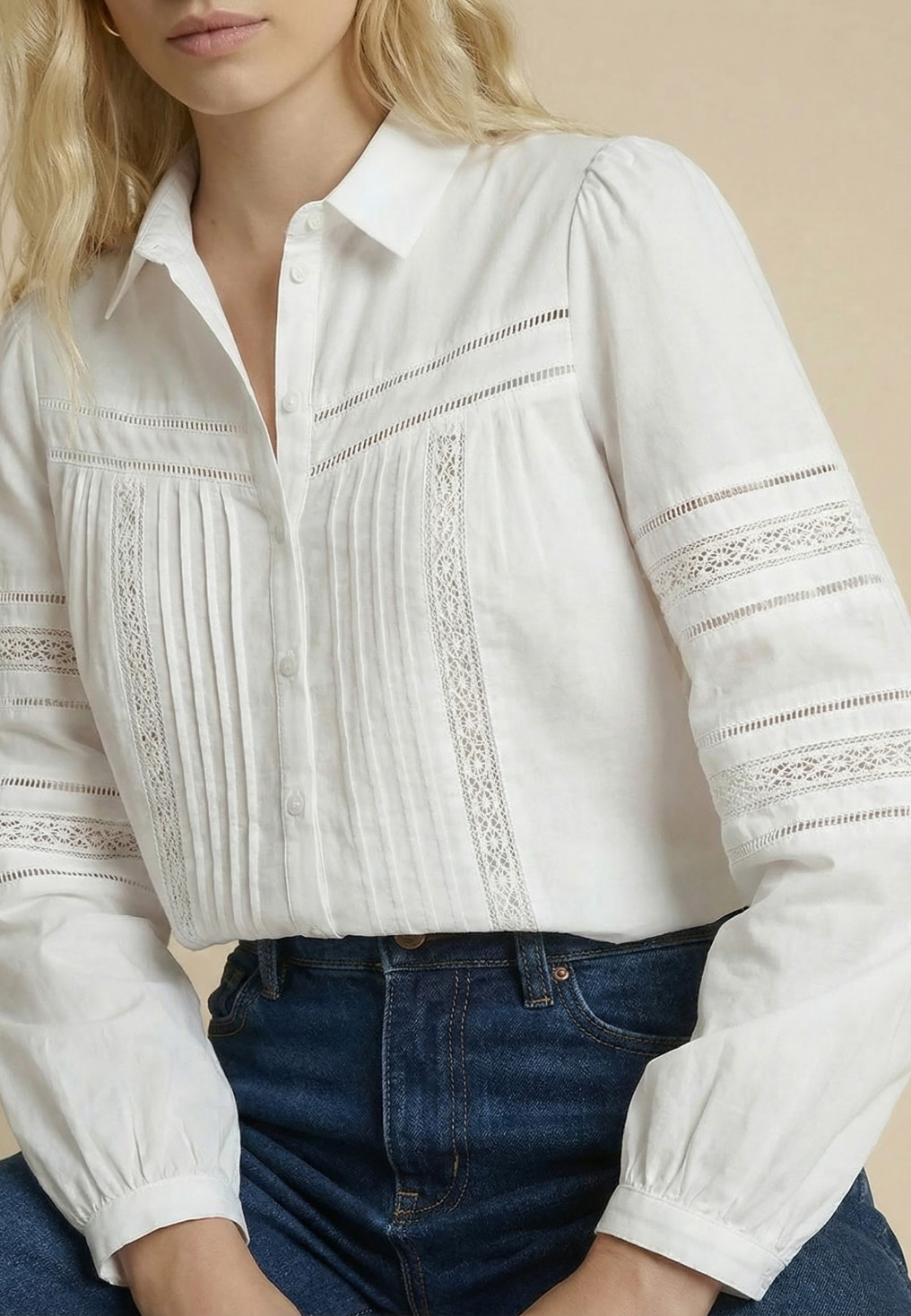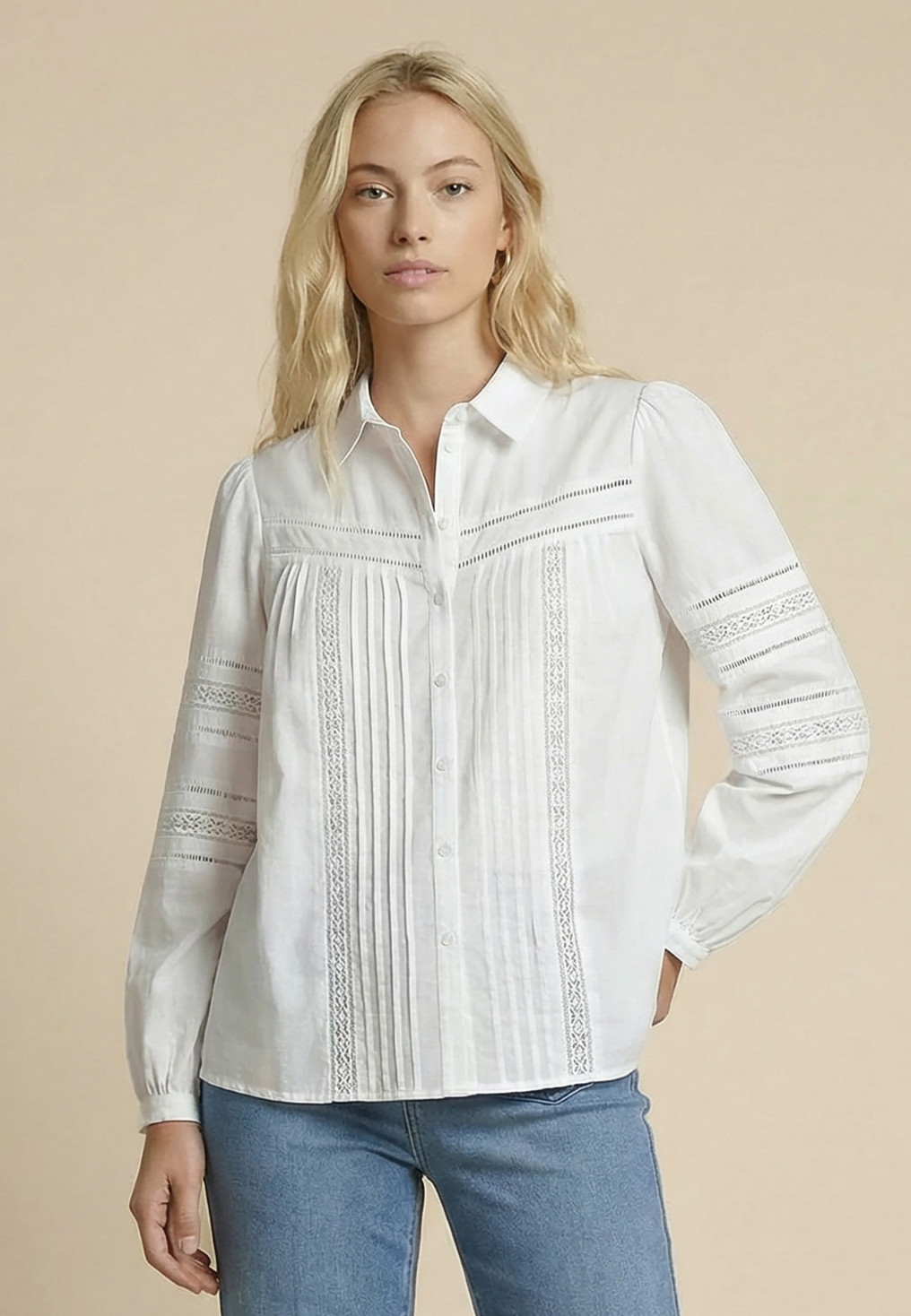 - Sur le devant et les manches : dentelle, plis plats et jour échelle